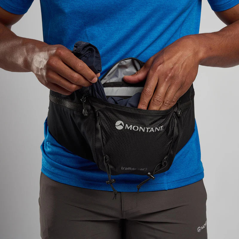 The Montane Trailblazer 3L Waist Pack is the perfect size pack for fast and light missions where you need the bare essentials, but you still want to carry walking poles. The durable design has been updated with RAPTOR CROSS LITE 70D recycled fabric that has a PFC-Free DWR coating to keep your valuables dry. The Trailblazer 3L Waist Pack is built to adapt to your adventure with the new Montane T-Hook system and the easy-to-access storage options, while the highly breathable air mesh back panel and secure straps add comfort for long days on the trail. This durable waistpack is the ultimate companion for fast-paced mountain missions, including walking, hiking and fastpacking.